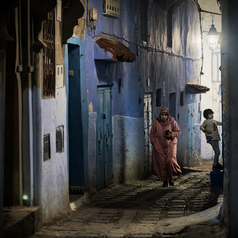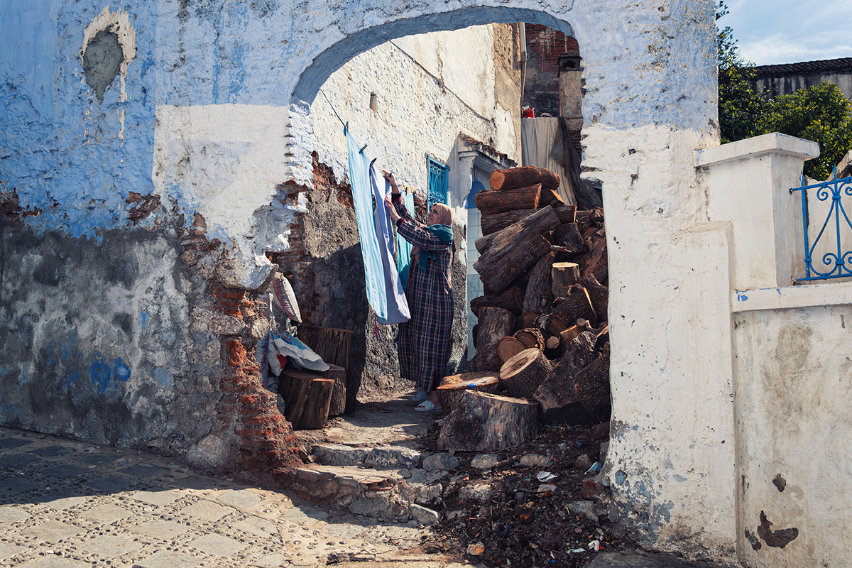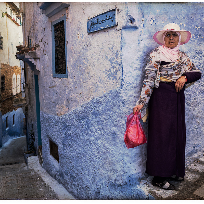 In Chefchaouen, blue is not a colour. It is a state. The woman leaning against the wall, with the red bag in her hand, seems part of the scenery. Her gaze is direct, sincere, unmasked. The walls are witnesses to a simple, repetitive life — yet full of meaning.