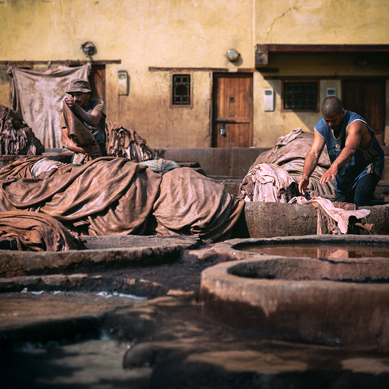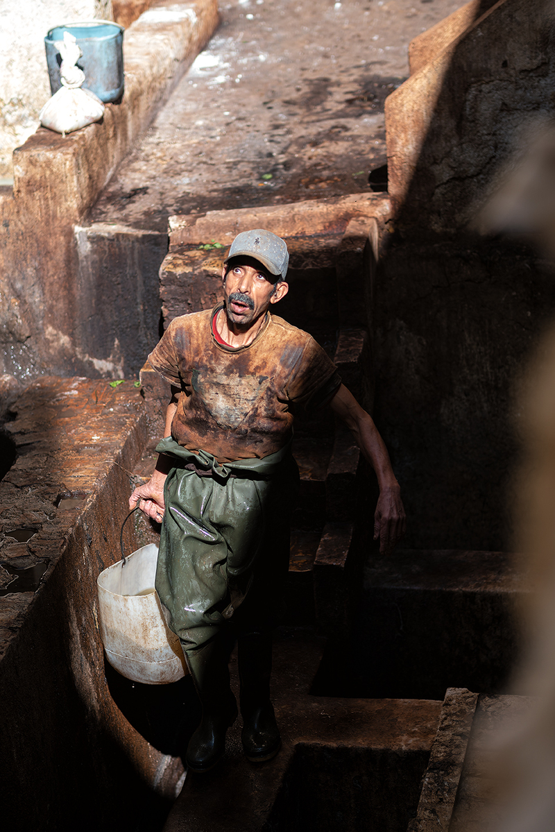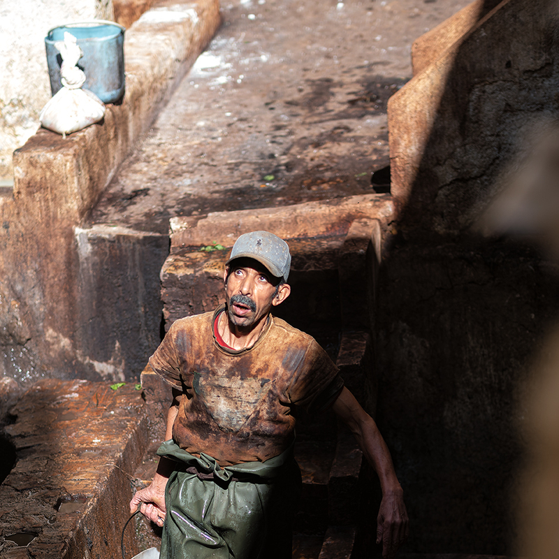 In the tanneries, men work with bare hands in dirty water, under a sun that falls like a raw blessing. One raises his eyes toward the sky, as if asking something without words. His weariness says more than any speech. Here, time has not changed for hundreds of years.