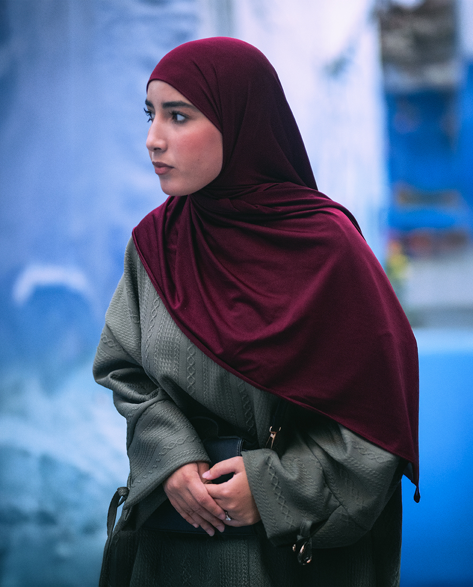 The burgundy hijab draws a warm line in a cold, blue world. The contrast is not only chromatic — it is human. Between tradition and modernity, between interior and exterior, between what is seen and what is felt.
