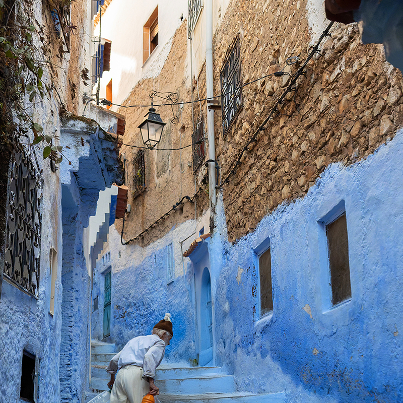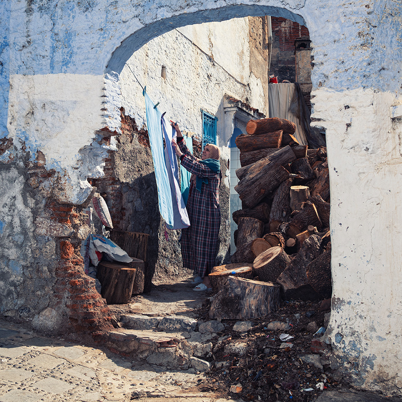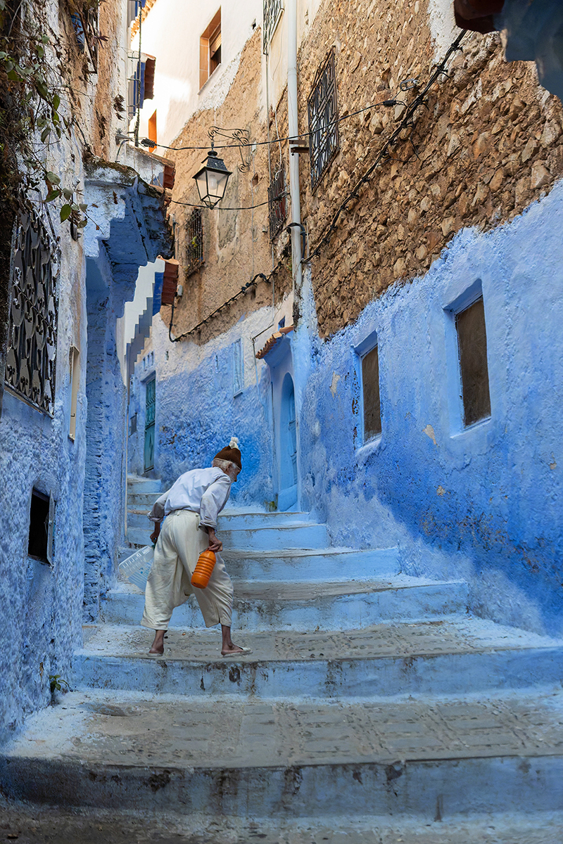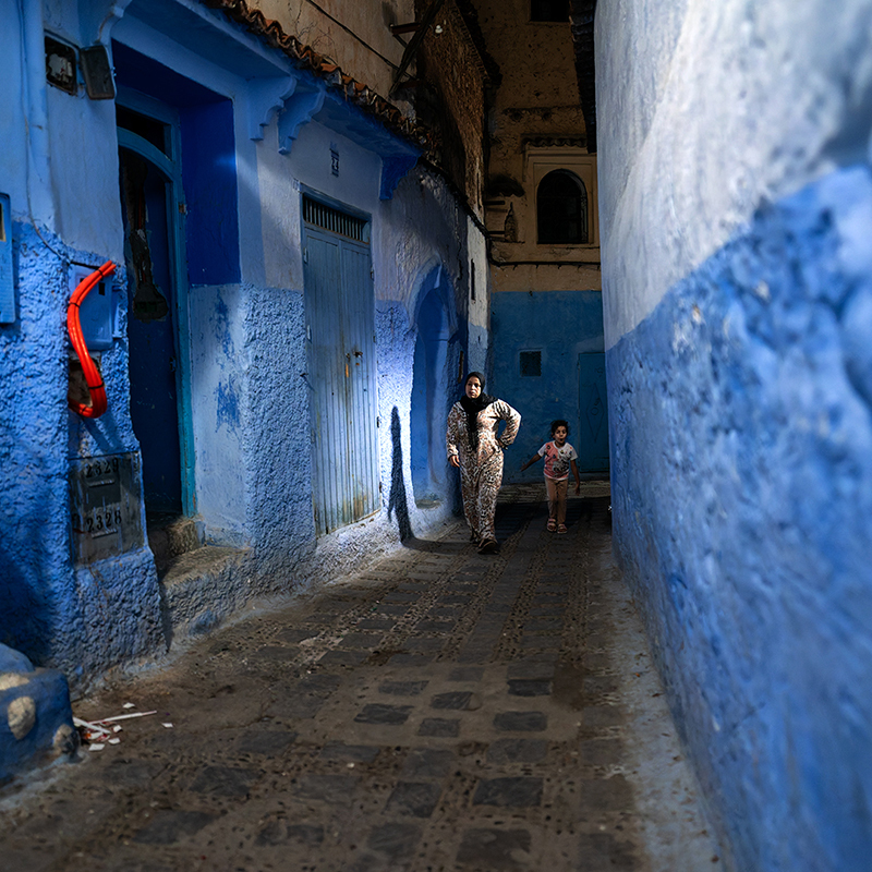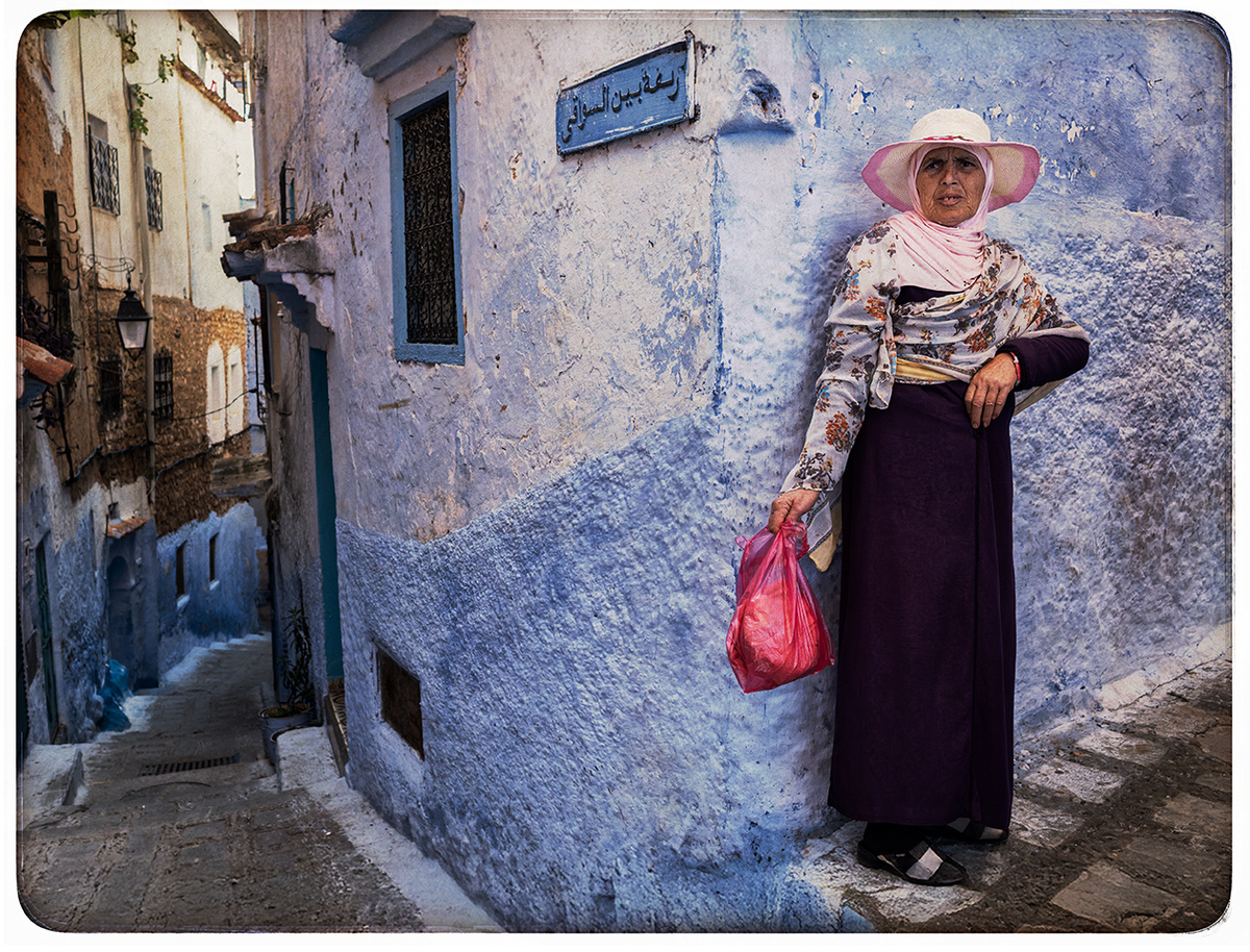 In Chefchaouen, blue is not a colour. It is a state. The woman leaning against the wall, with the red bag in her hand, seems part of the scenery. Her gaze is direct, sincere, unmasked. The walls are witnesses to a simple, repetitive life — yet full of meaning.