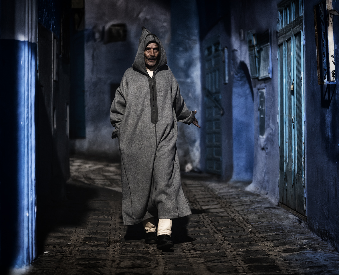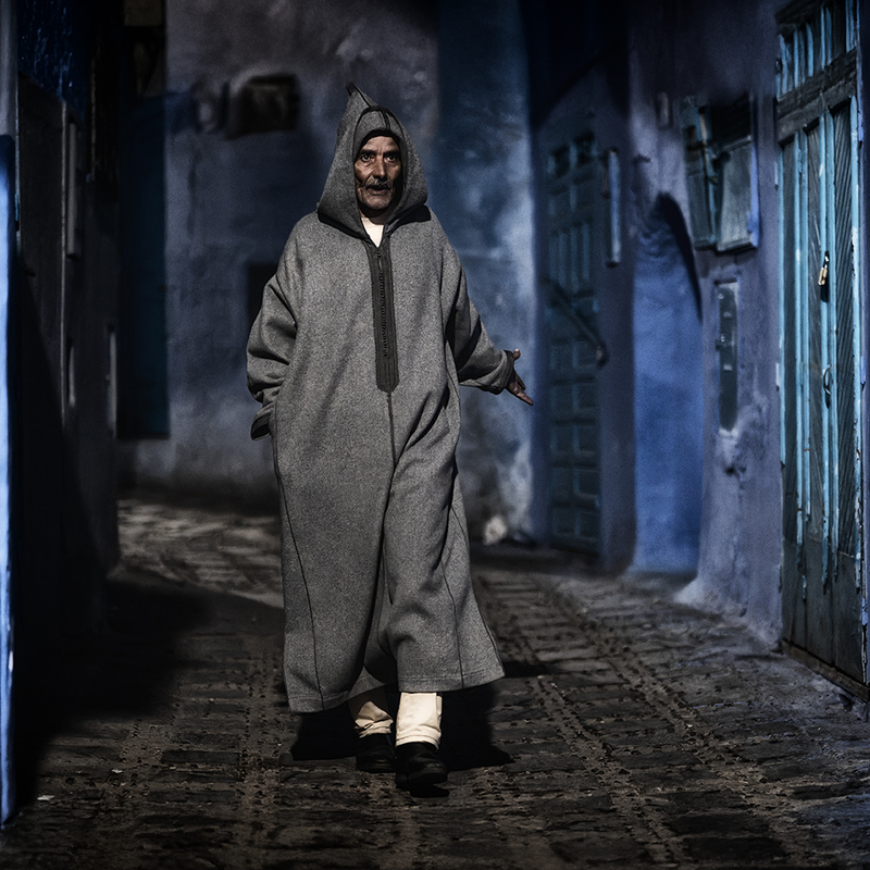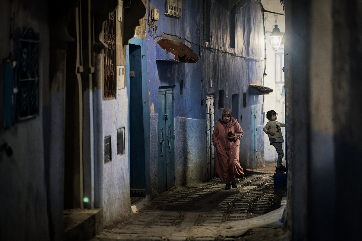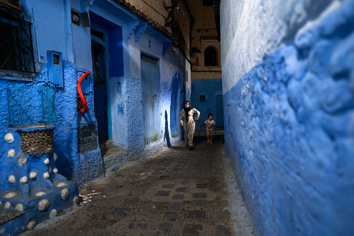 In Chefchaouen, blue is not a colour. It is a state. The woman leaning against the wall, with the red bag in her hand, seems part of the scenery. Her gaze is direct, sincere, unmasked. The walls are witnesses to a simple, repetitive life — yet full of meaning.