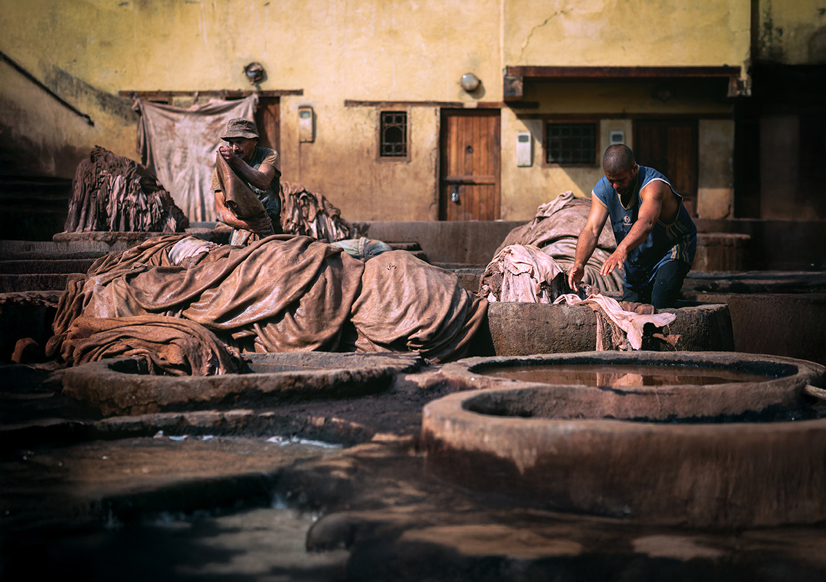 In the tanneries, men work with bare hands in dirty water, under a sun that falls like a raw blessing. One raises his eyes toward the sky, as if asking something without words. His weariness says more than any speech. Here, time has not changed for hundreds of years.