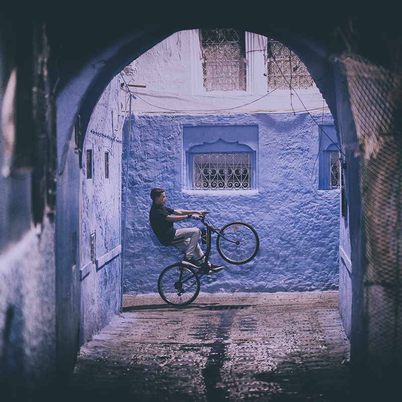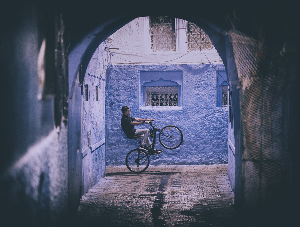 In the evening, the blue streets become stages. A child jumps. A woman passes. A cyclist lifts his front wheel exactly under a perfect arch. A fraction of a second in which everything aligns. The moment exists only once.